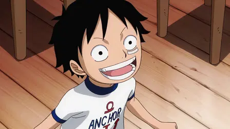 A little boy Luffy was enthralled with a pirate boss Red-Haired Shanks. But a group of mountain bandits shows up and makes fun of the pirates. “Why didn't you fight them?!” Luffy yells out angrily but Shanks says that it's nothing worth getting mad over. At that time, Luffy snatches the Gum-Gum Fruit from a treasure box and eats it and as a result, his entire body becomes rubber and he loses the ability to swim for the rest of his life!